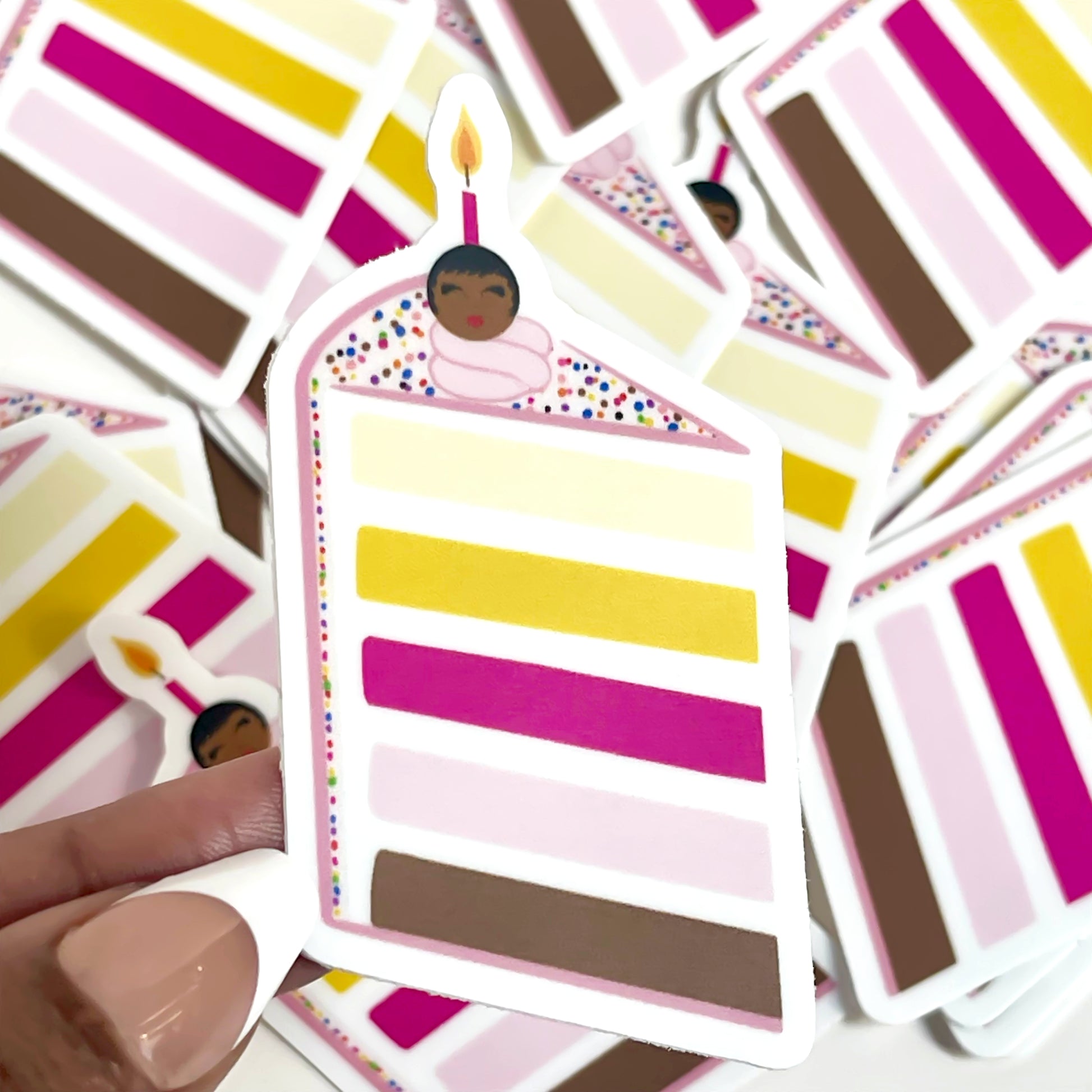 A five layer slice of sweetness! This vibrant sticker features colorful sprinkles, icing, a lit candle, and one of our sassy Sparkle Blu girls, straight from our imaginary bakery of fun.