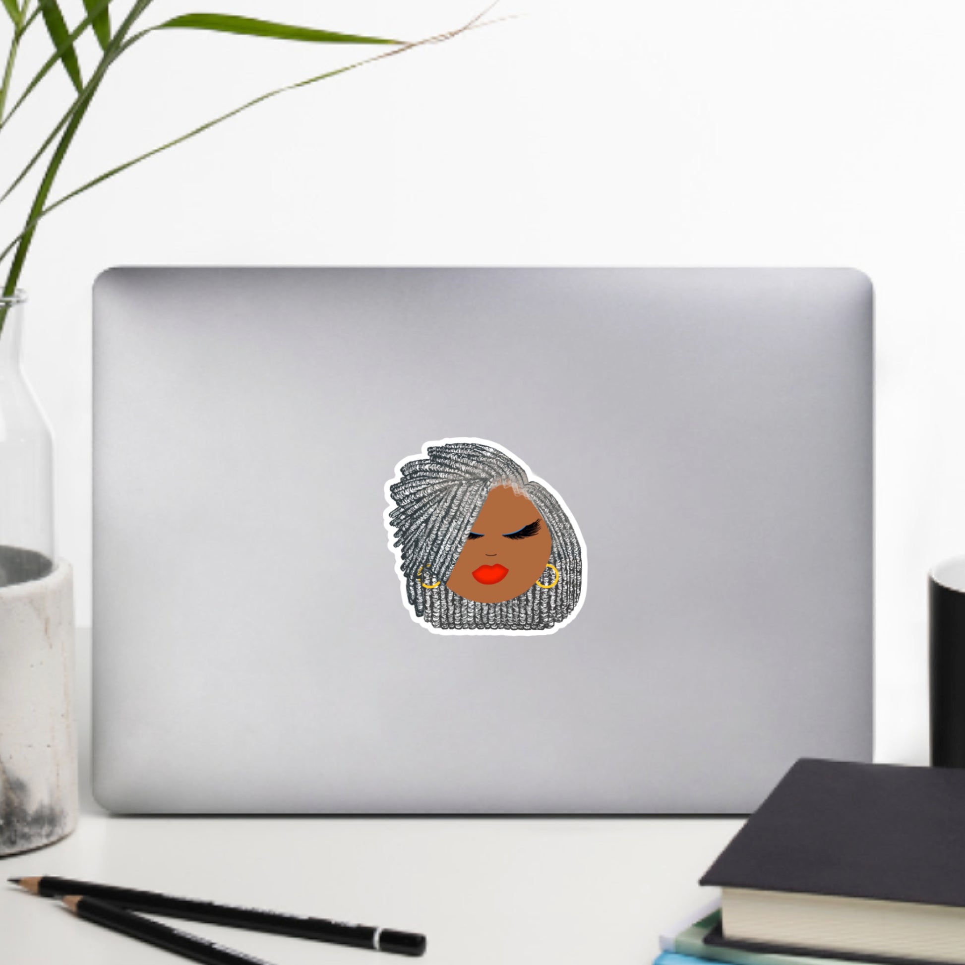 Introducing Charmaine, the epitome of timeless in our latest waterproof sticker collection! With gracefully gray/grey hair locs, vibrant red lipstick, captivating blue eyeliner, and adorned with chic gold hoop earrings, Charmaine exudes sophistication.