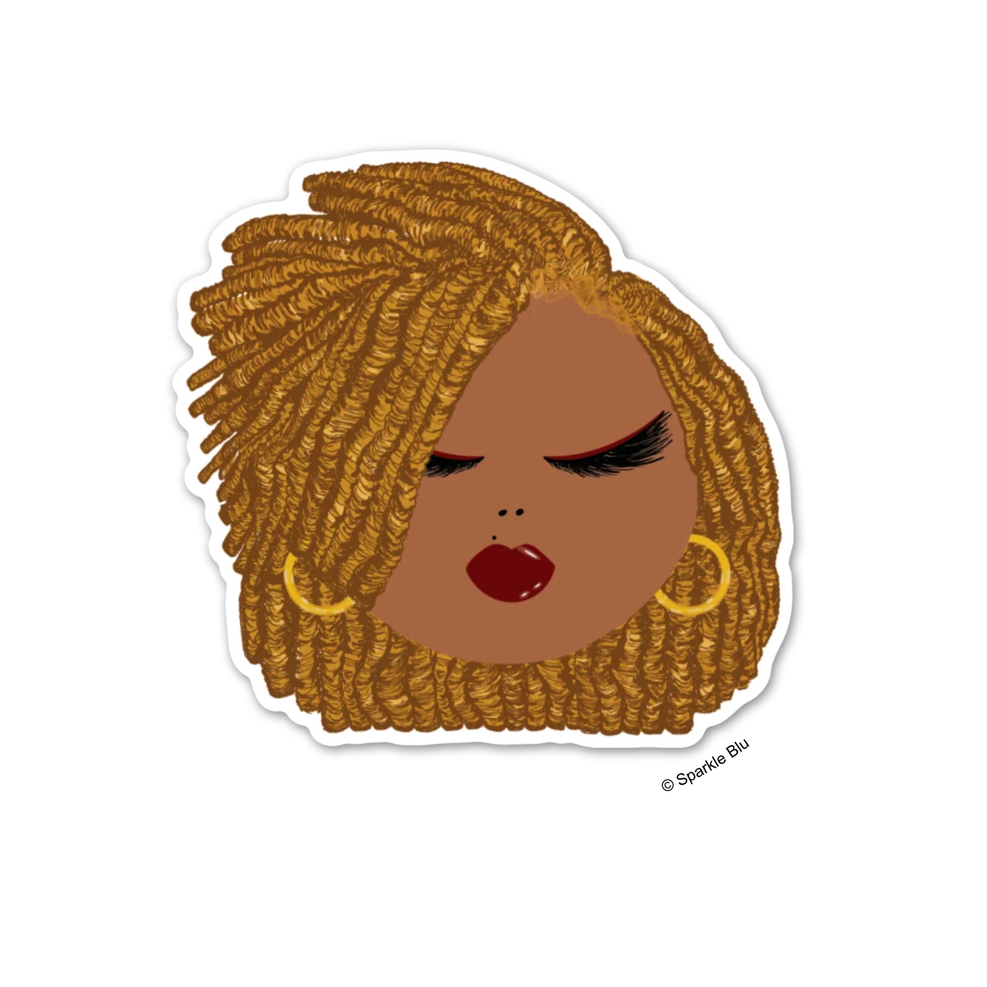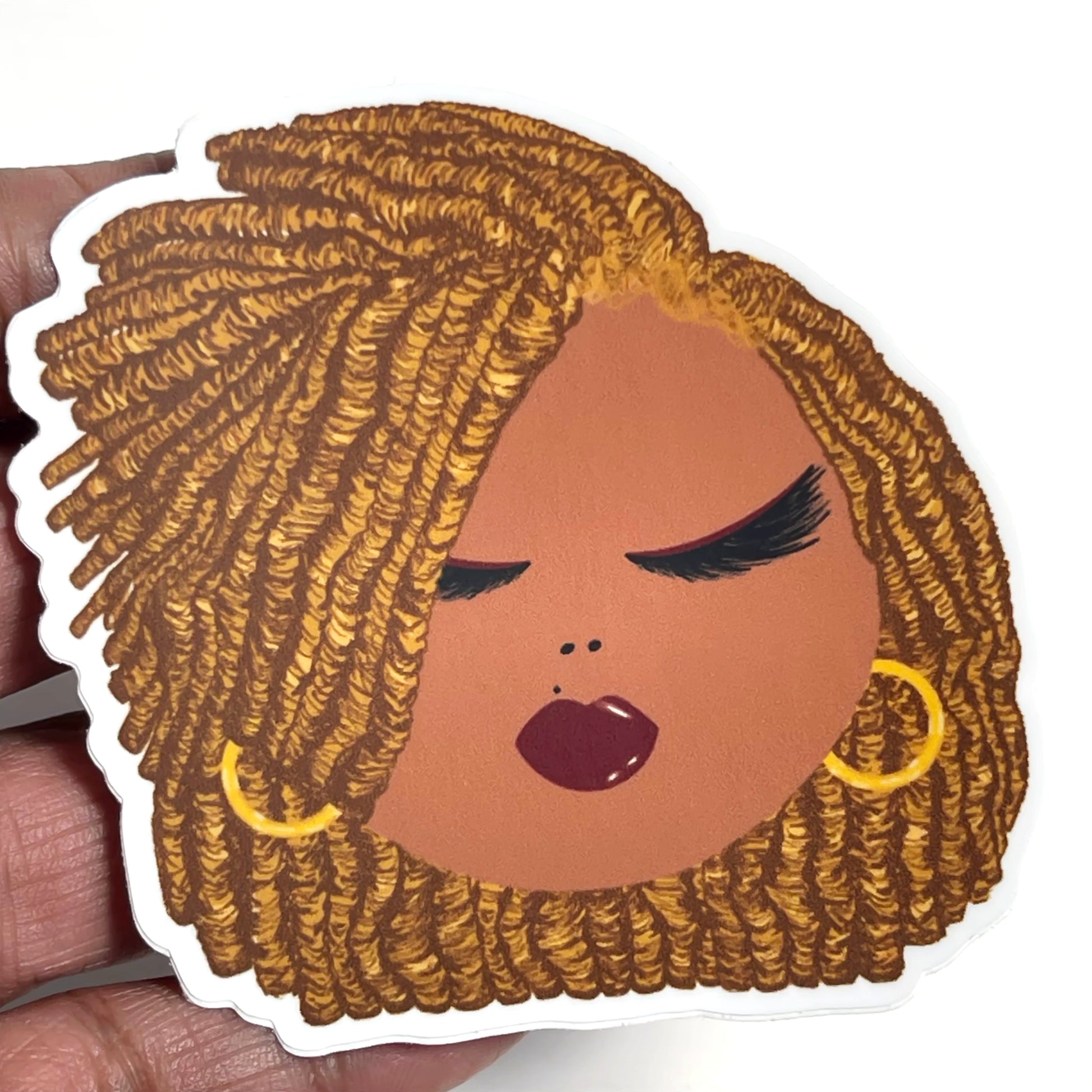 Meet Coreena! Our Coreena Woman Sticker is here to add a touch of glamour to your collection. Featuring blonde locs, deep burgundy lipstick, brown eyeliner, gold hoops, and a distinctive mole just above her lip, Coreena embodies style and confidence. This vinyl waterproof sticker is perfect for decorating your water bottles, laptops, planners, and more.