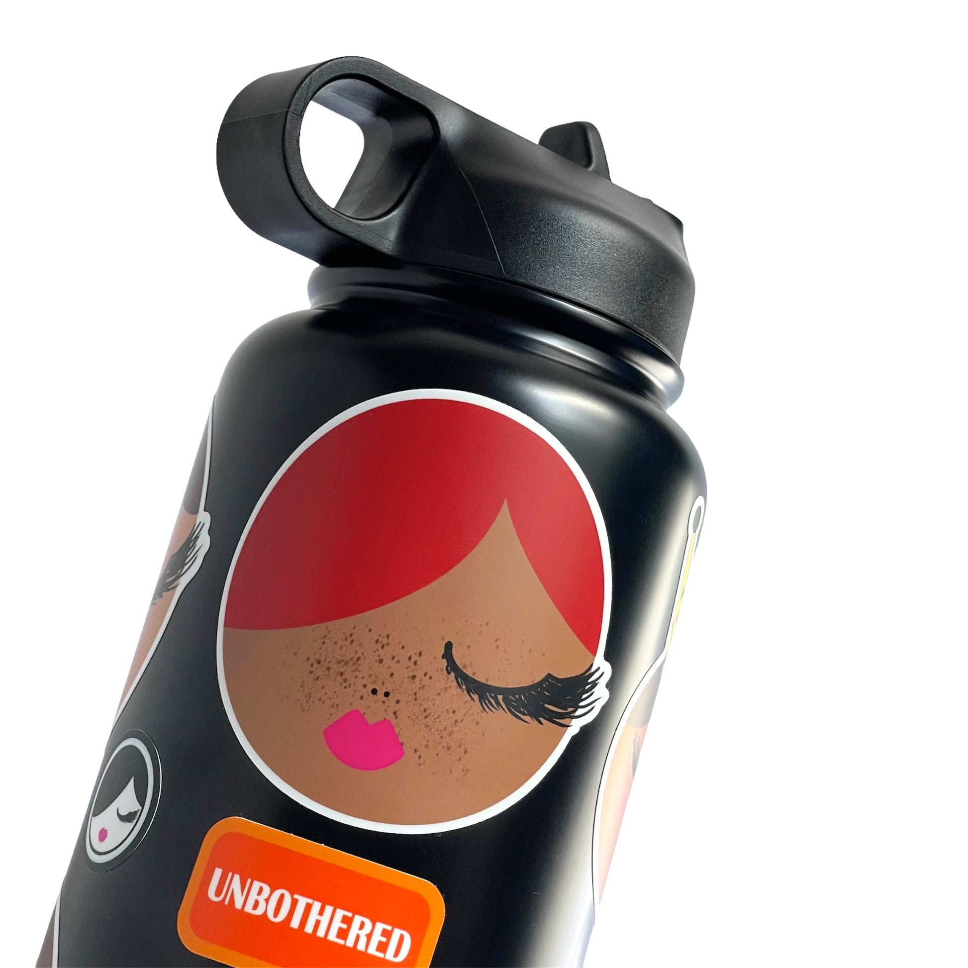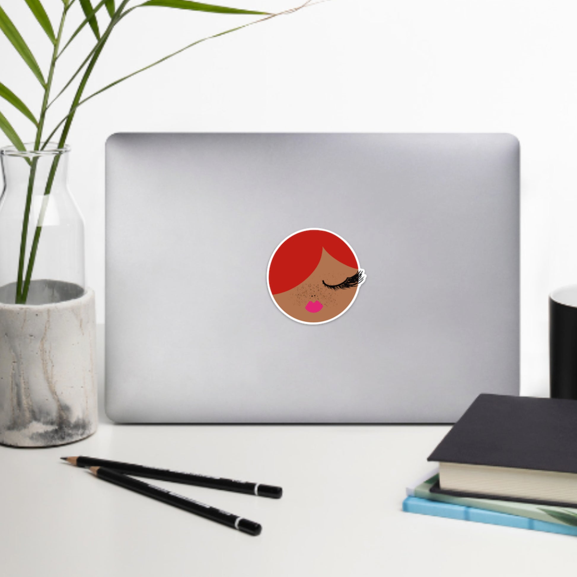 Meet the adorable Ginger! Featuring long, fluffy black lashes, pink lips, and charming freckles, Ginger's warm golden skin and vibrant red hair bring a splash of personality to any surface. This sticker is perfect for adding a bit of sass and style to your laptop, notebook, or phone case.
