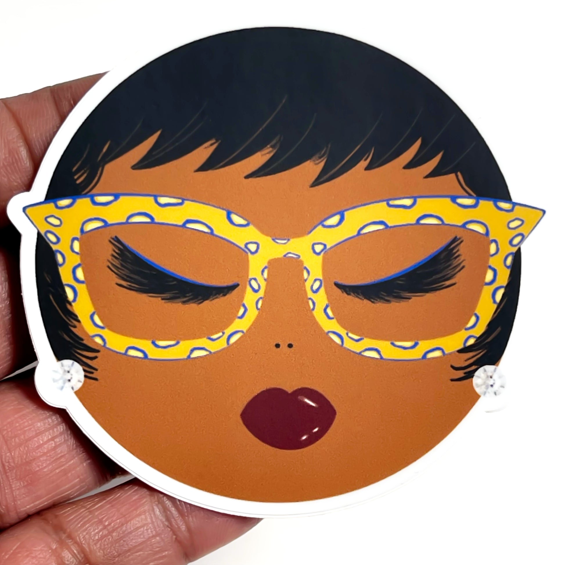 Glenis has a stylish pixie haircut, royal blue eyeliner and wine lipstick, perfectly complementing her rich skin tone. Her accessorizing is impeccable, featuring diamond stud earrings and oversized cat-eyed gold and royal blue eyeglasses that enhance her look, exuding an air of elite charm.