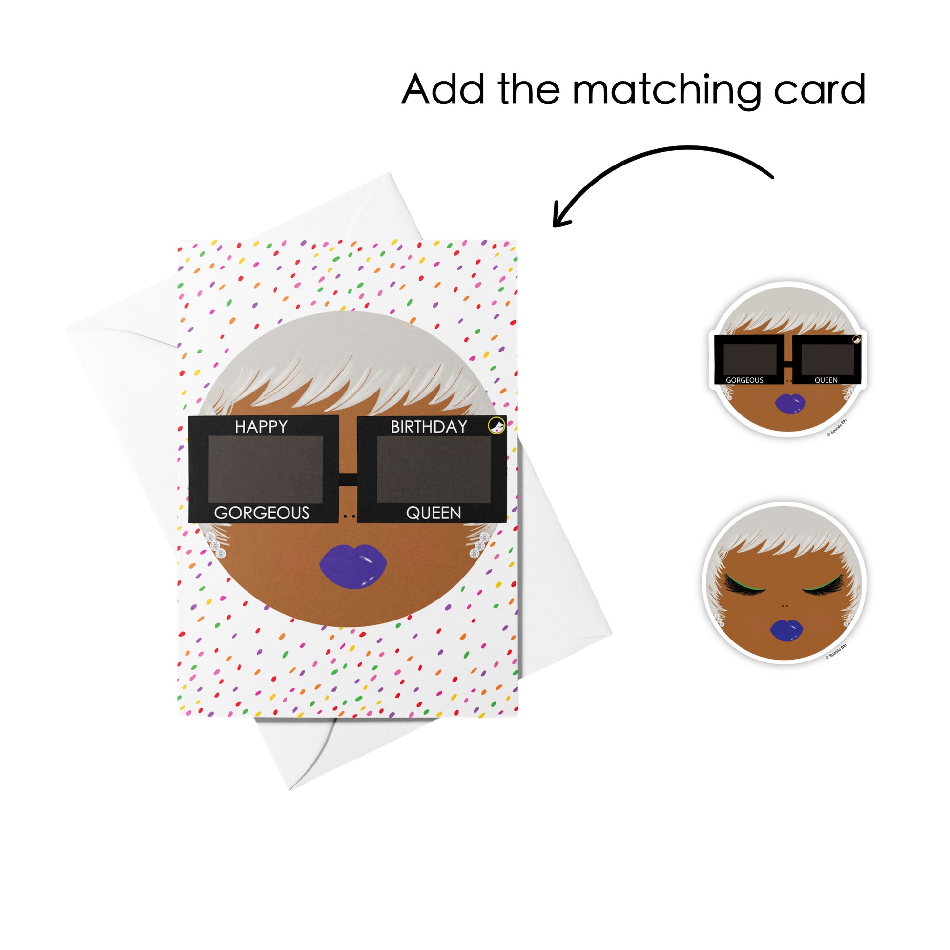 For the queens who love to make a statement, Sasha delivers bold style with oversized square sunglasses, a sharp gray pixie cut, and unstoppable confidence. A standout sticker that pairs perfectly with the matching card.
