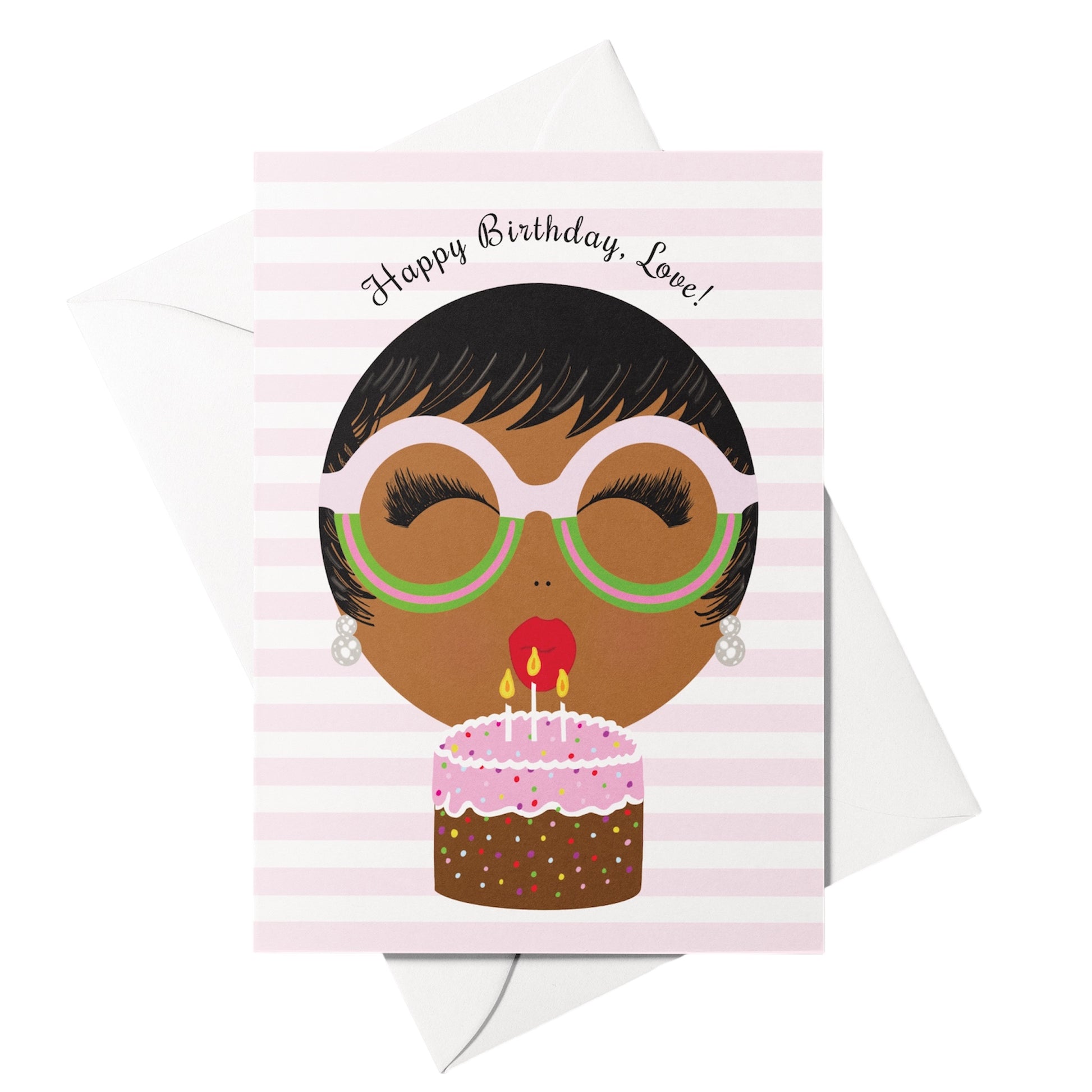 Let her know she’s loved and celebrated—just as she is. This joyful card features one of our Sparkle Blu girls blowing out candles and living her best birthday life. If you’ve been looking for a birthday card that actually reflects a beautiful Black woman…this is it. Pink and green glasses? Say less.