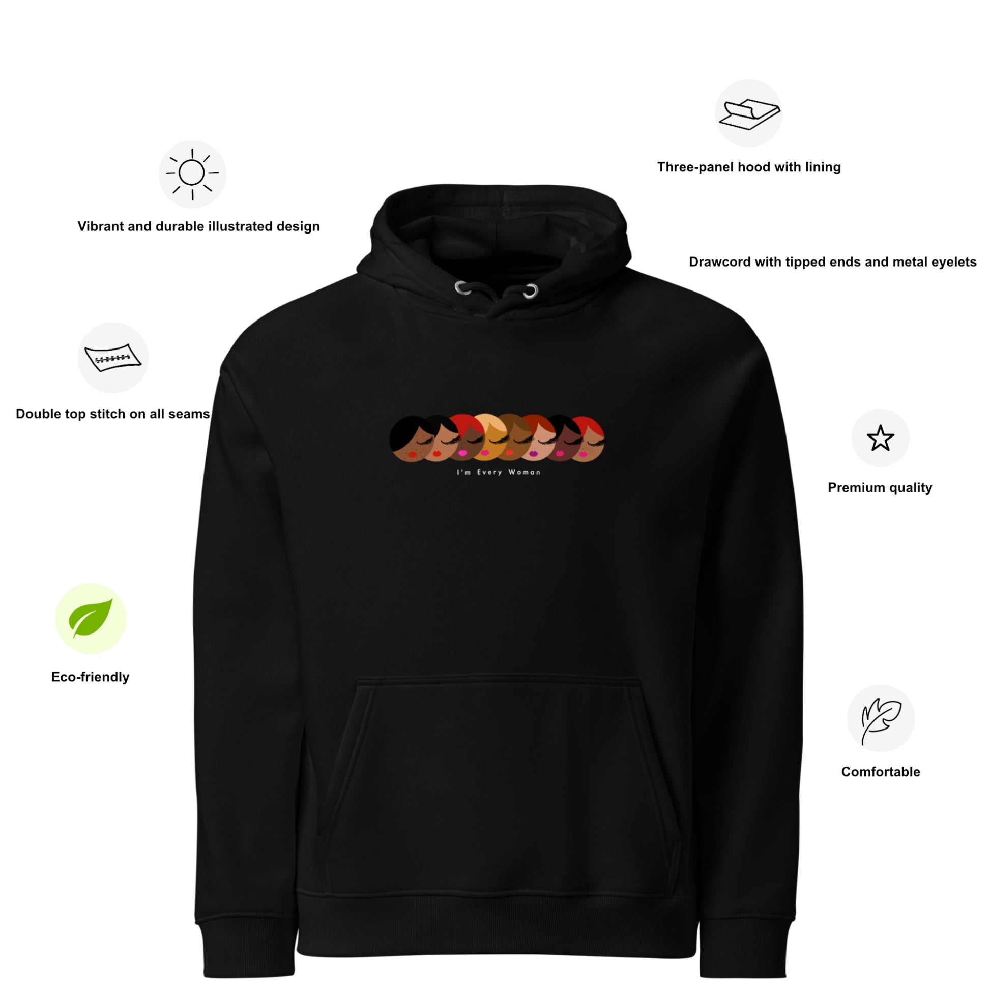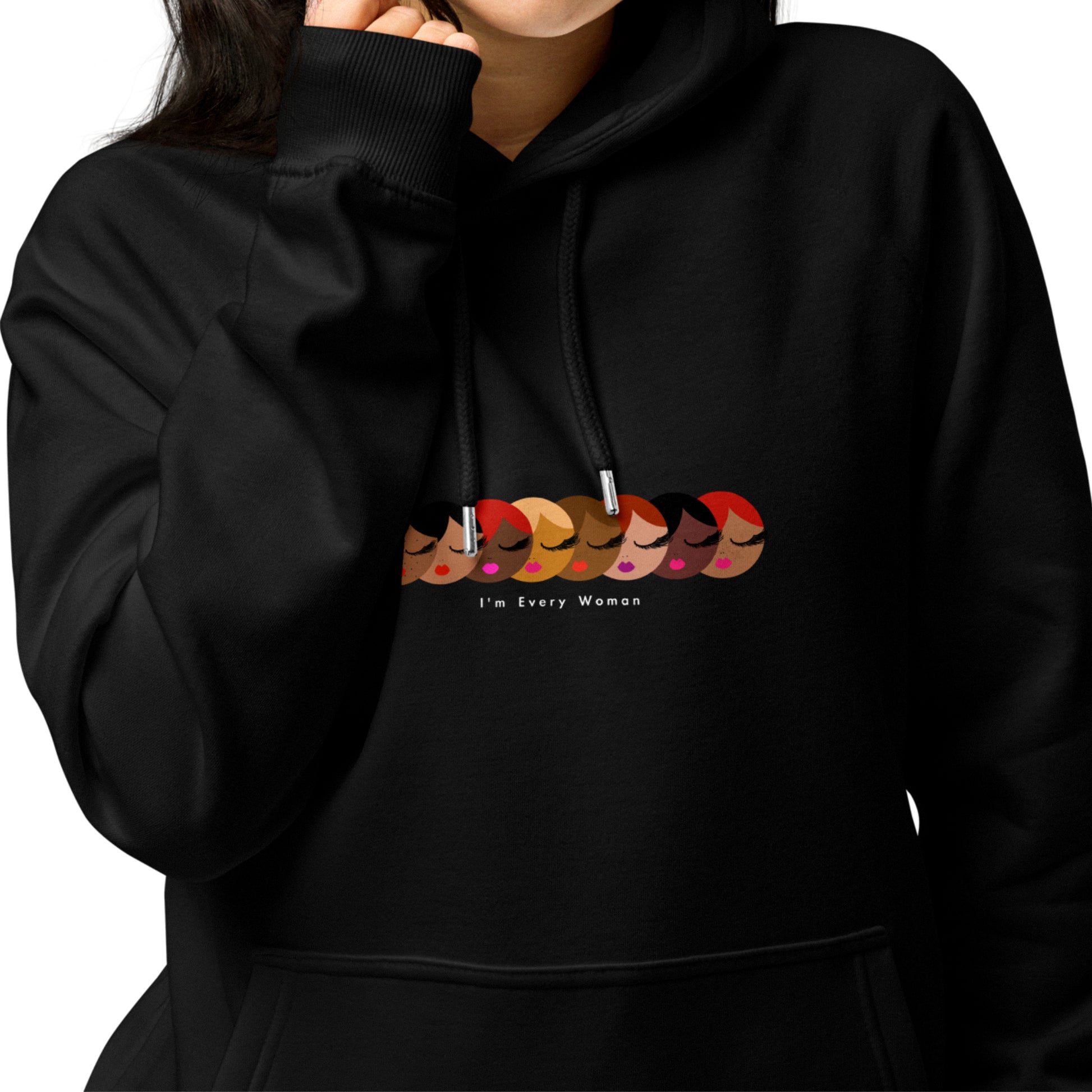 Celebrate the strength and beauty of sisterhood with our “I’m Every Woman” hoodie. This design showcases diverse, iconic characters representing the power of women supporting women, with a colorful illustration that’s both stylish and meaningful.