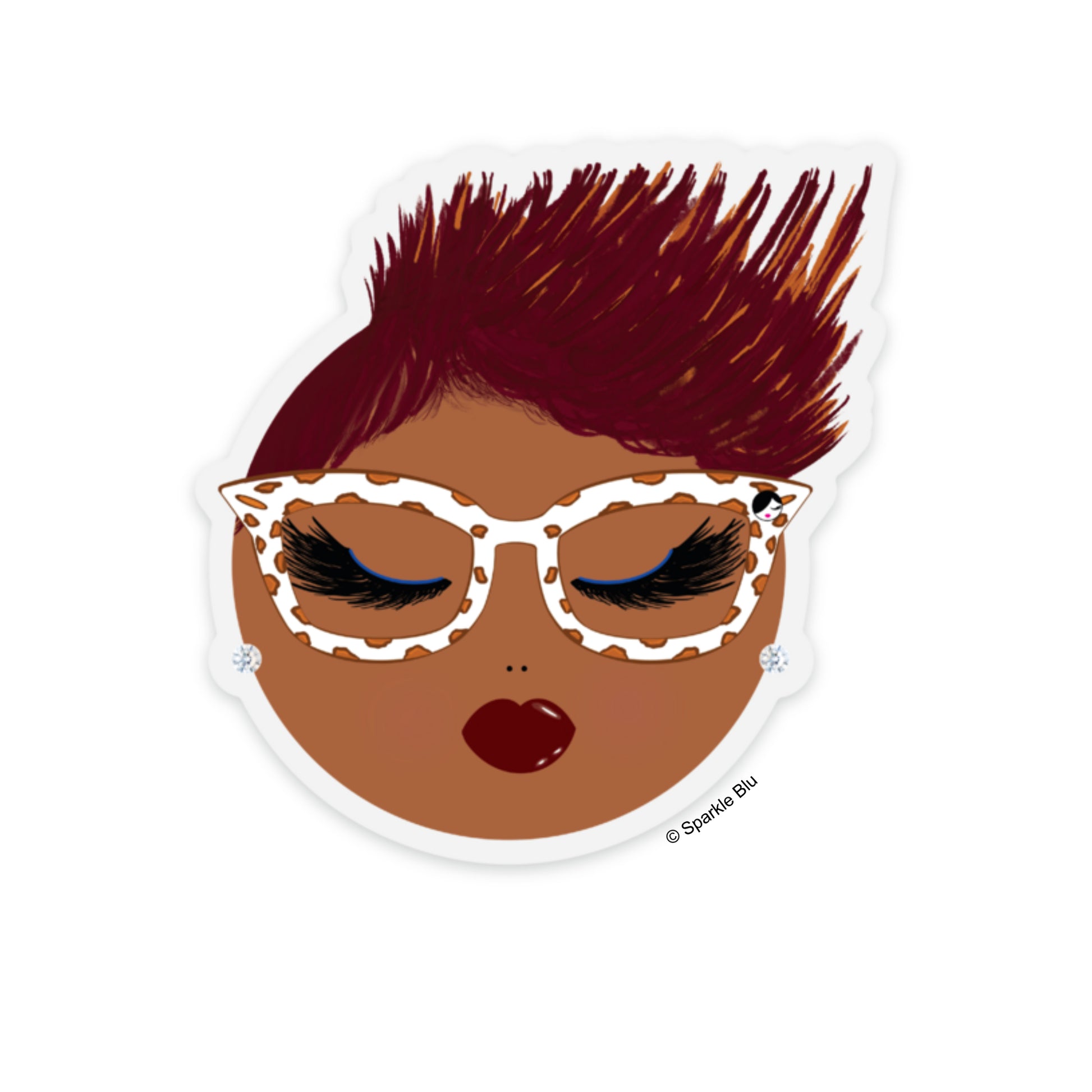 Linda exudes effortless sophistication with her crimson hair kissed by copper highlights. Her navy eyeliner adds subtle definition, while her lips pop with deep burgundy lipstick. Linda’s diamond studs provide just the right touch of elegance. However, it's her studious cat-eye glasses adorned with stylish decorations that truly complete her refined look.