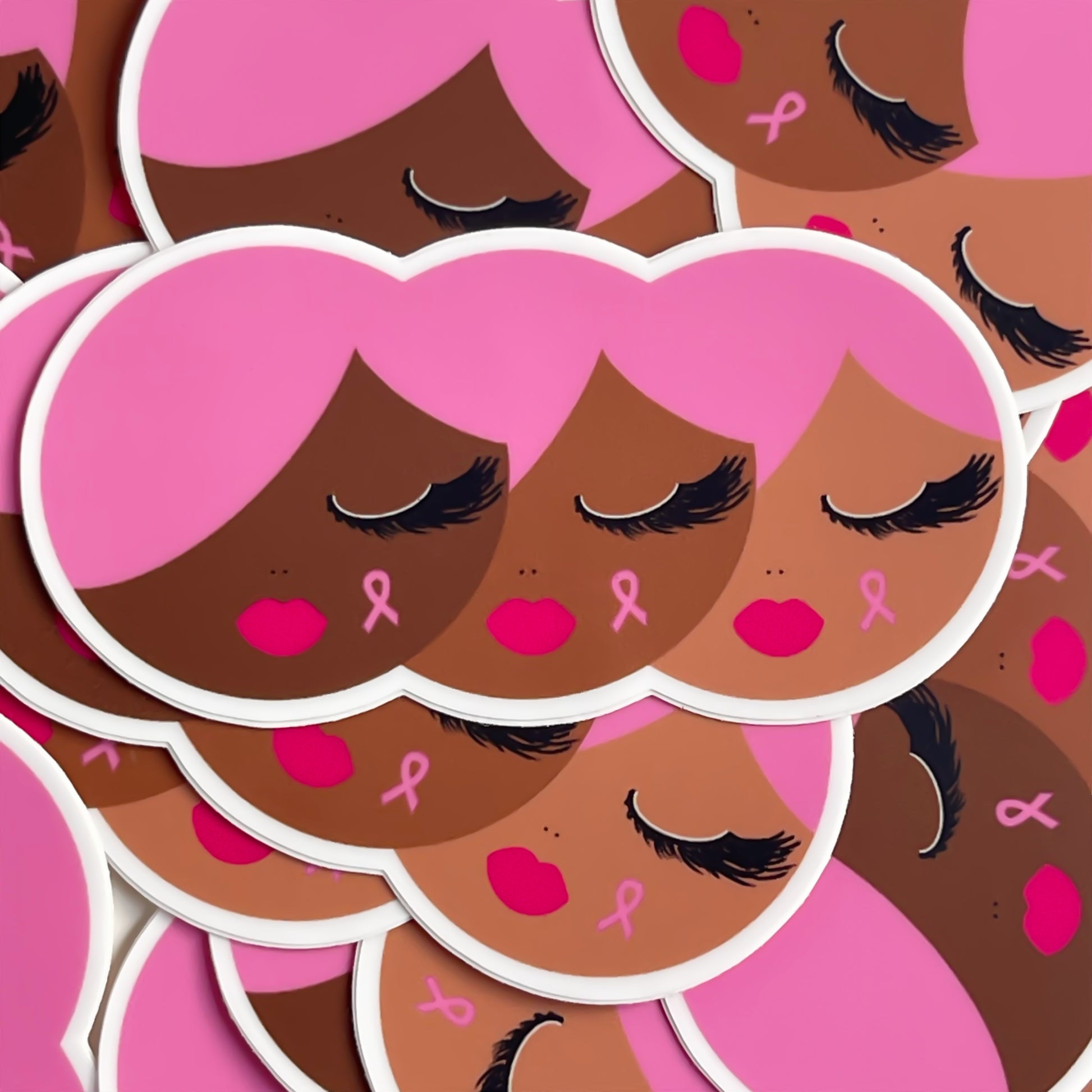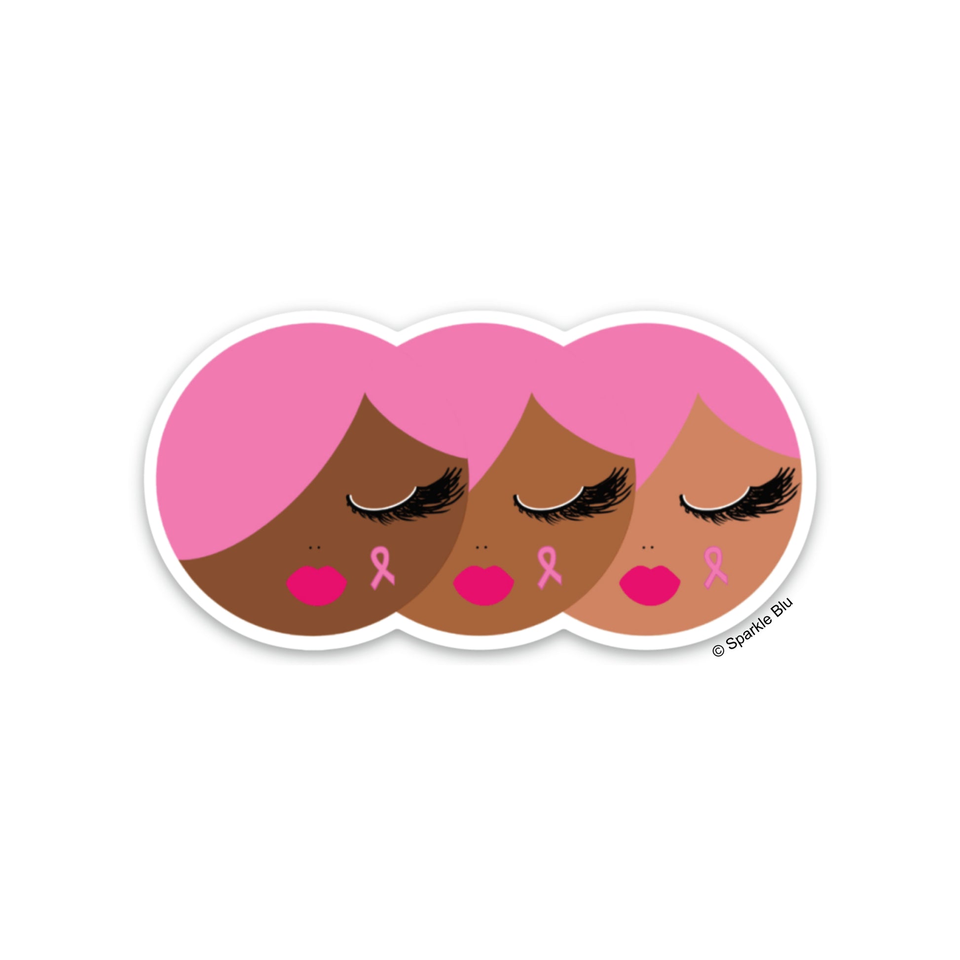 ‘Love Faith Hope,’ a powerful symbol of solidarity in the fight against breast cancer. This design features three inspiring women, each with a unique skin tone, united by a common cause. Adorned with vibrant pink hair, matching lipstick, and a pink ribbon placed on their faces.