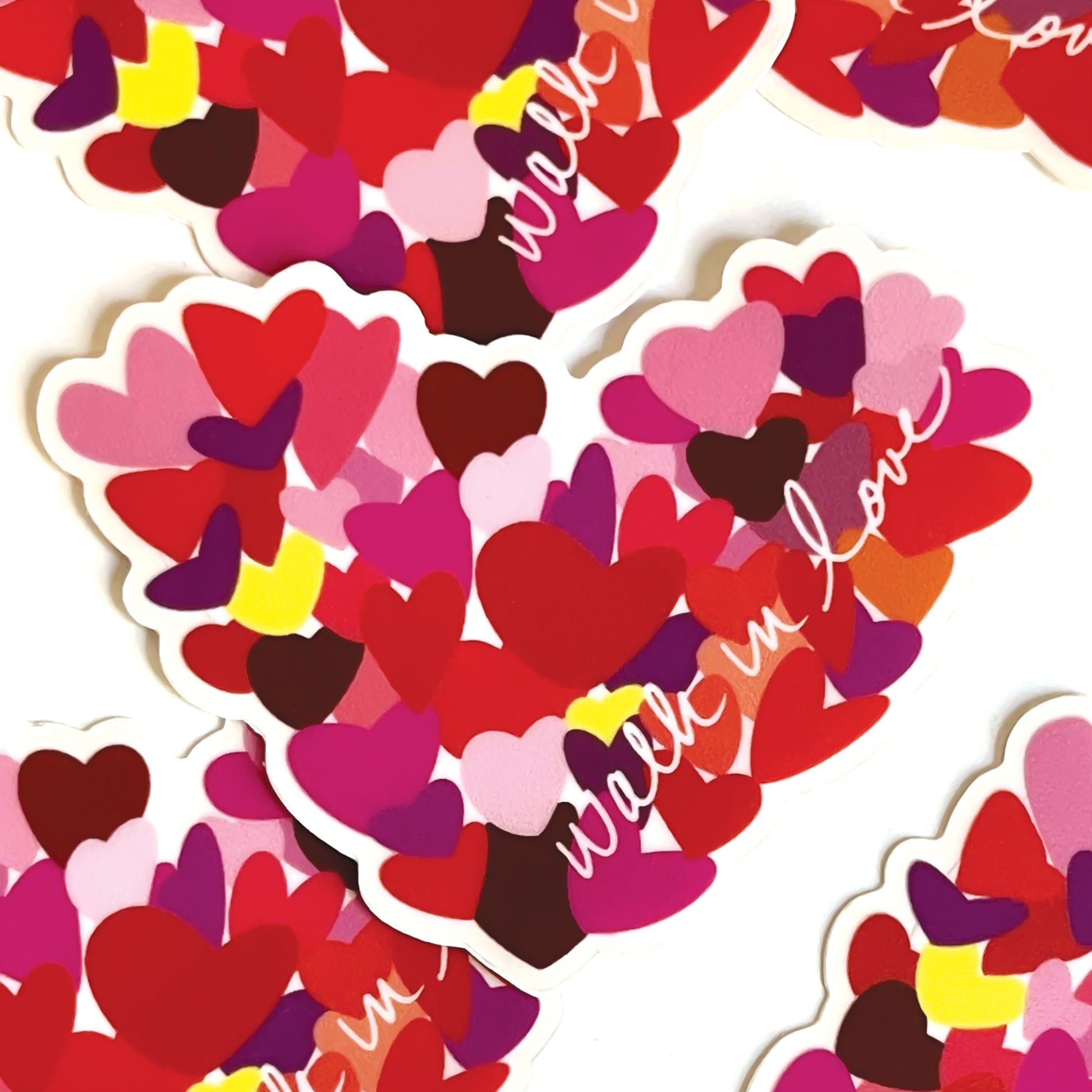 Spread love wherever you go with the 'Love’s Heart' sticker. This vibrant design features a stunning collage of colorful hearts coming together as one, with the elegant script message 'walk in love' at its center. A reminder to lead with kindness, compassion, and an open heart, this sticker is perfect for adding a touch of positivity to your favorite items.