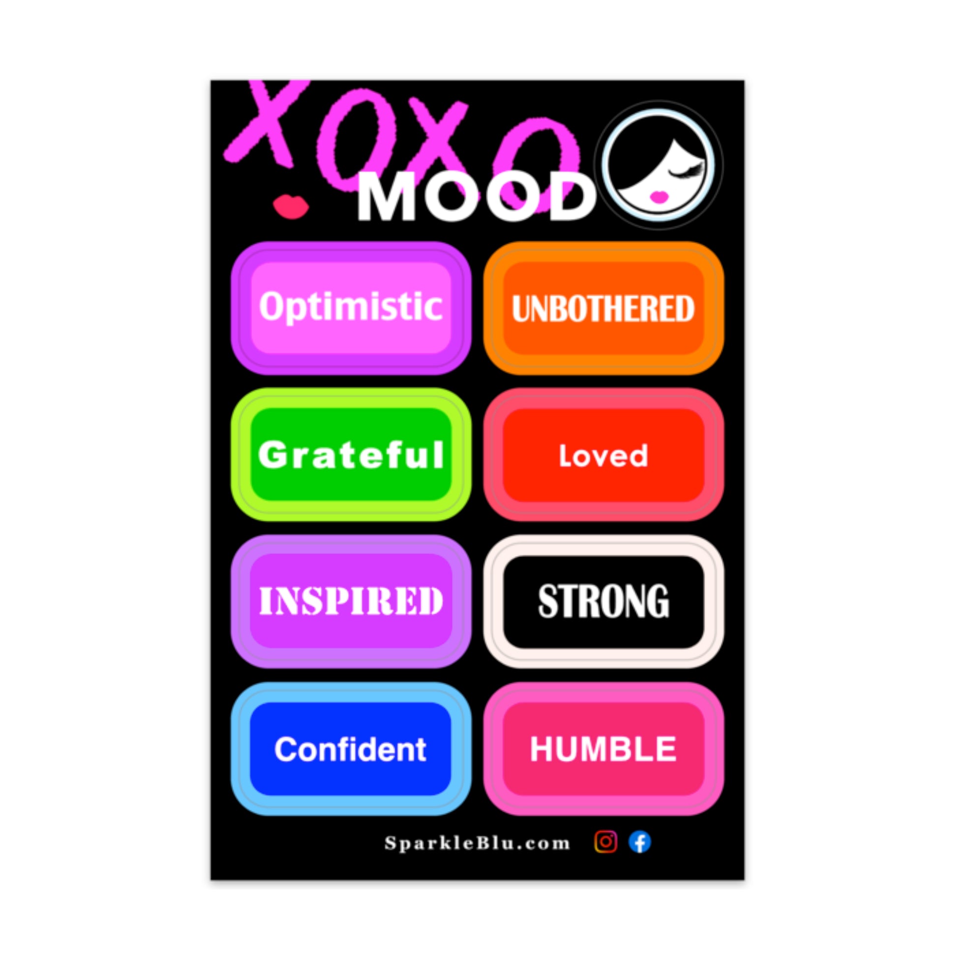 - One 4” x 6” sheet of 9 vibrant stickers (Optimistic, Unbothered, Grateful, Loved, Inspired, Strong, Confident, Humble, and Sparkle Blu Woman Logo)