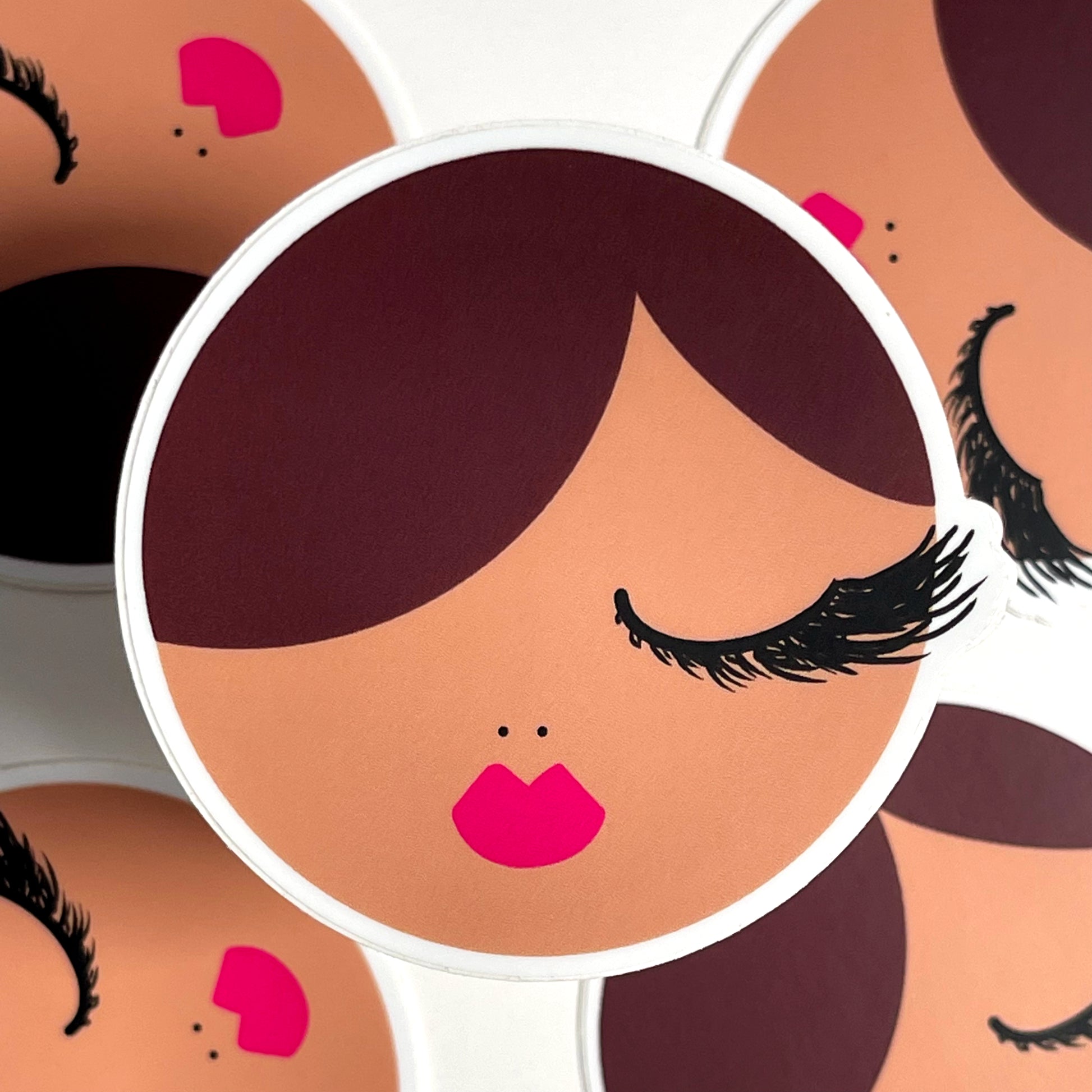 Here's Nina decorated with long fluffy black lashes, peachy skin, and fuchsia lipstick. Her sleek sienna brown hair makes this sticker a lively and eye-catching addition to your collection. Perfect for your laptop, water bottle, notebook, or phone case.