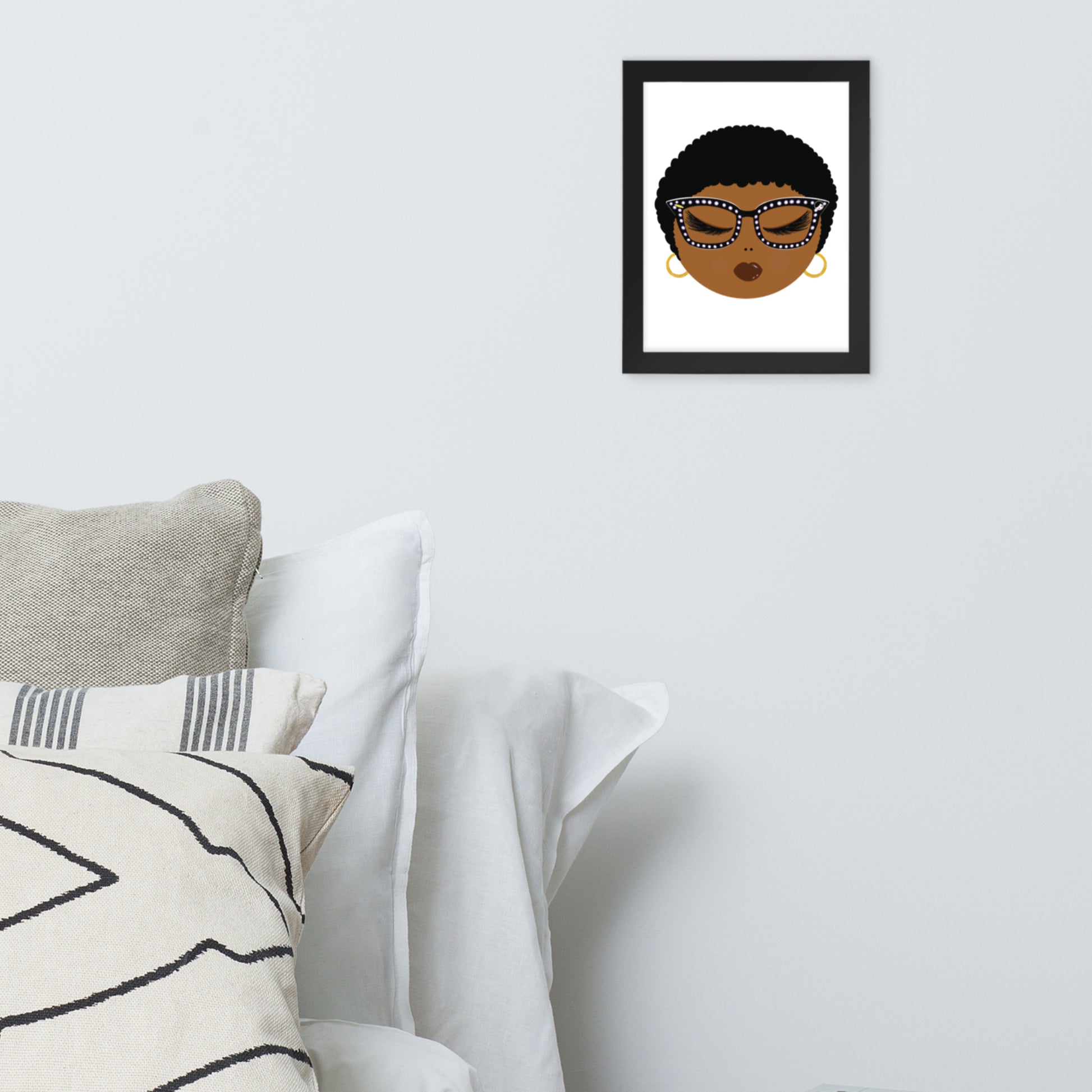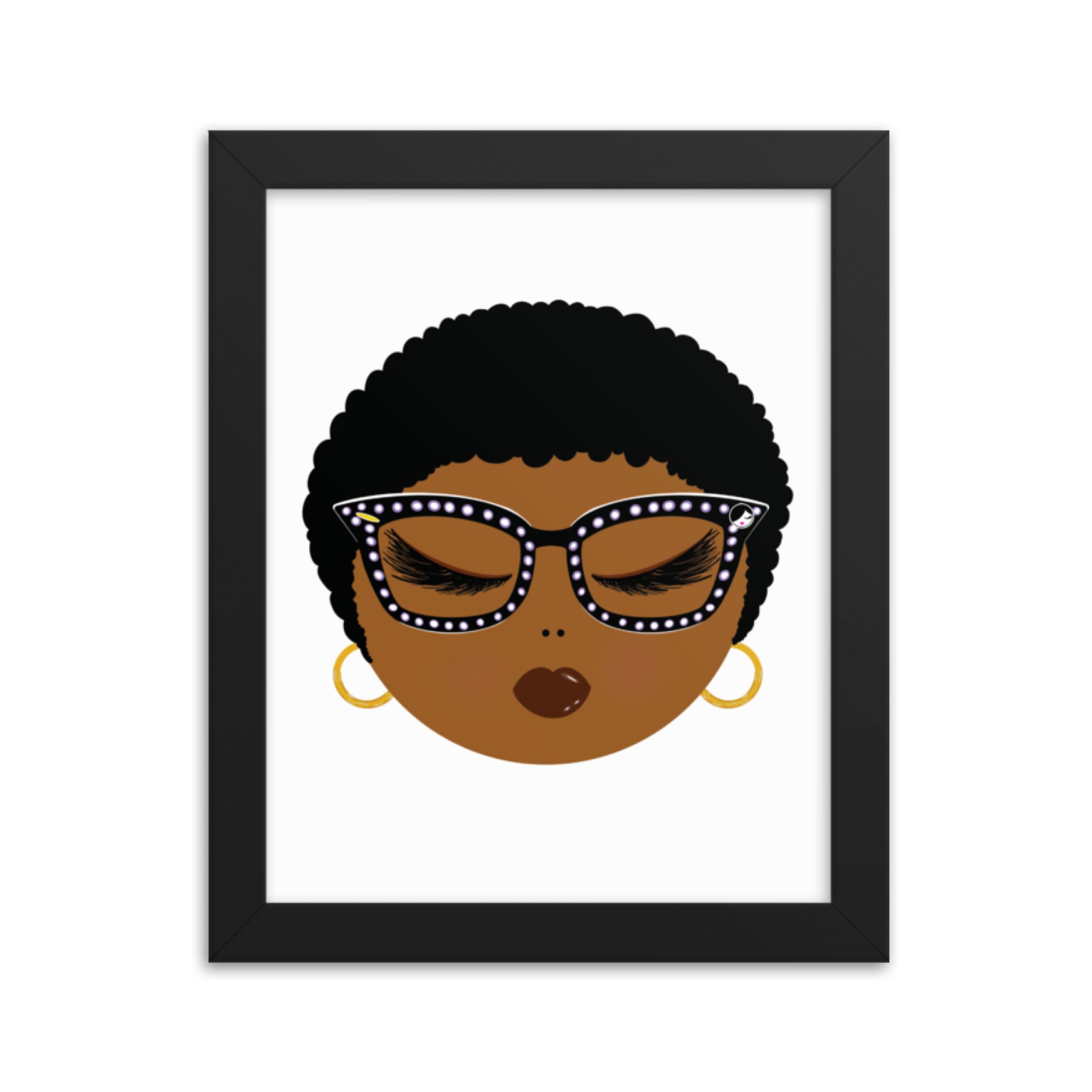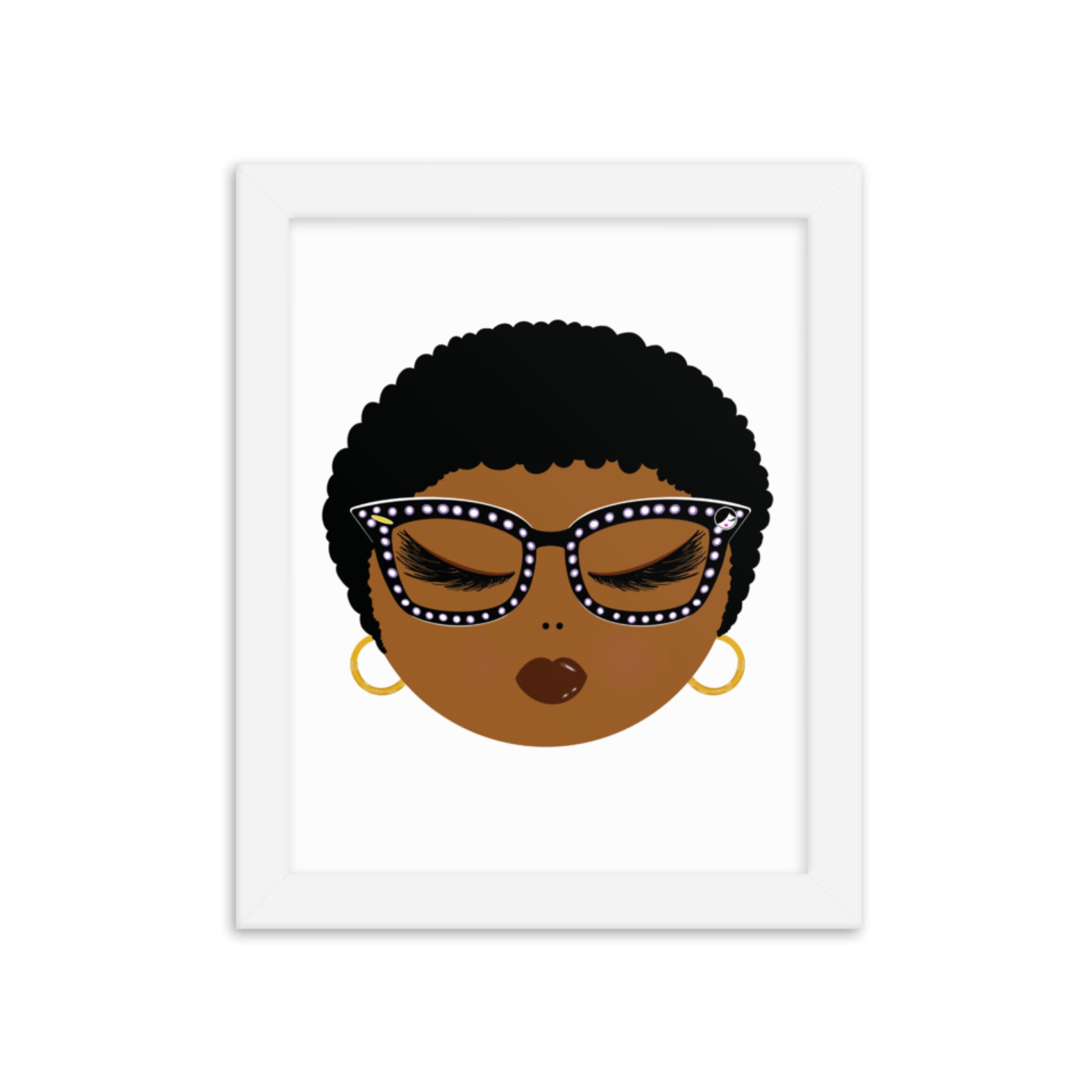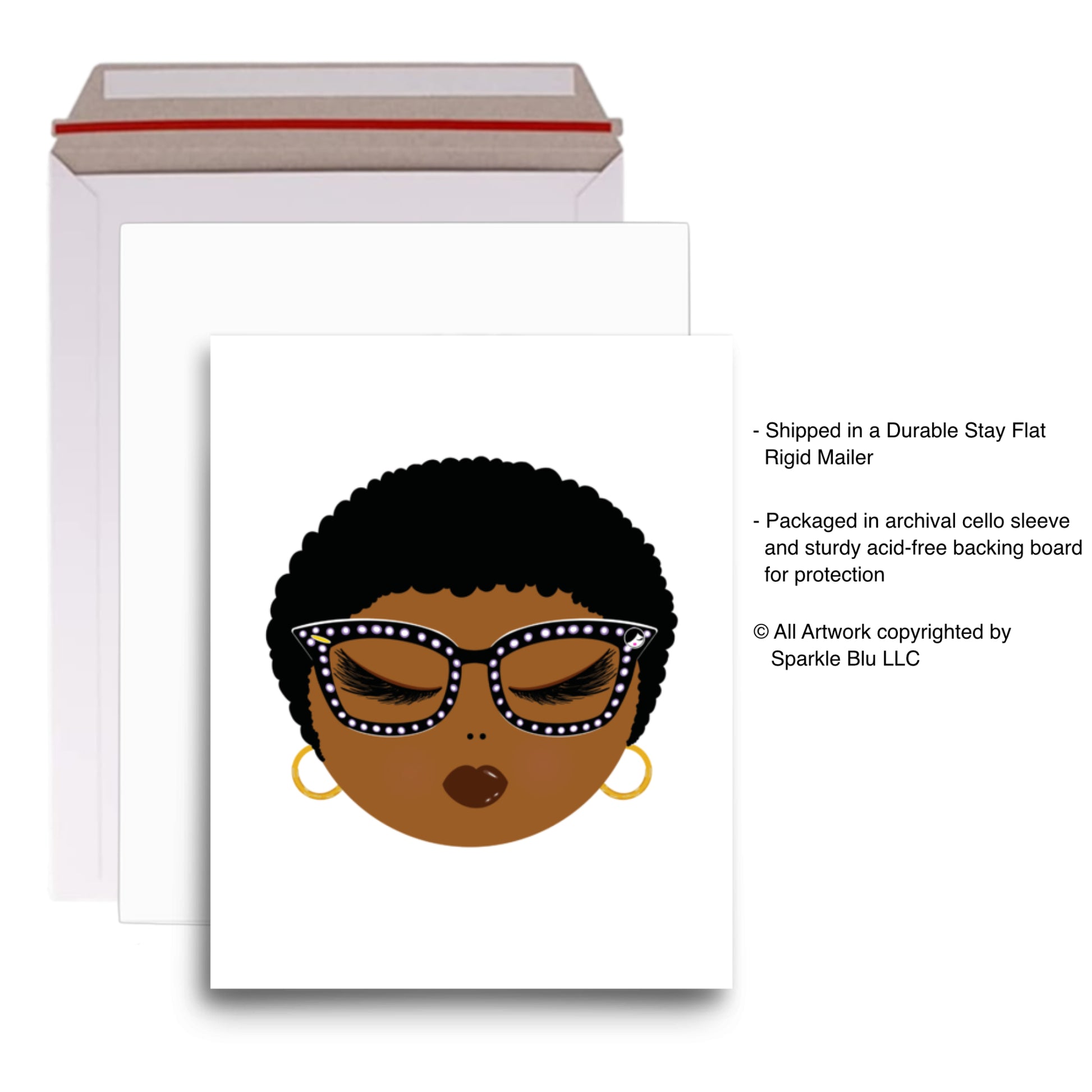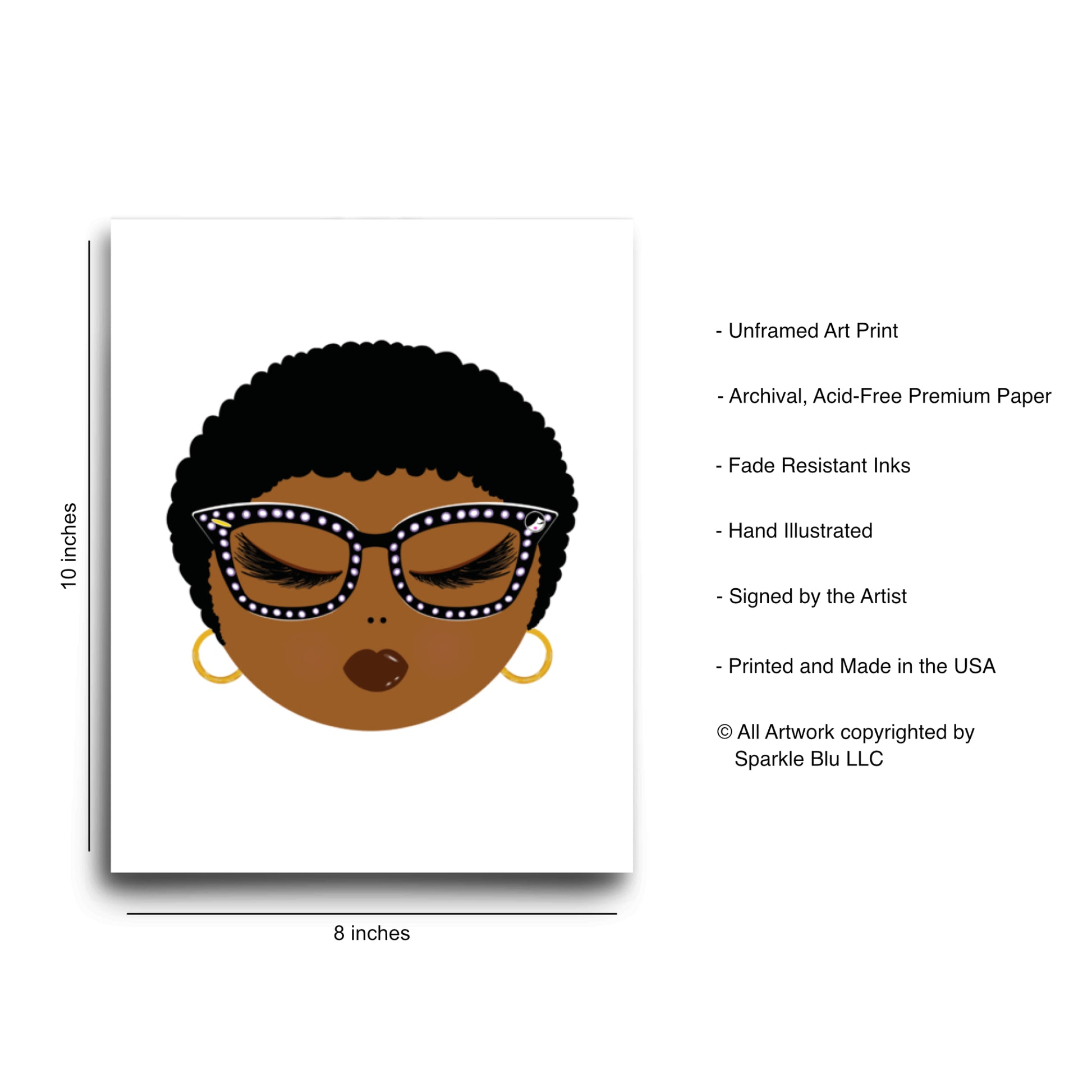 Regina exudes class and confidence with her cropped afro that radiates natural beauty. Her conservative brown lipstick adds to her classic style, while brown eyeliner complements her beautiful cocoa skin. Completing her look with small hoop earrings, Regina adds a modern flair with black cat-eye glasses adorned with white polka dots.
