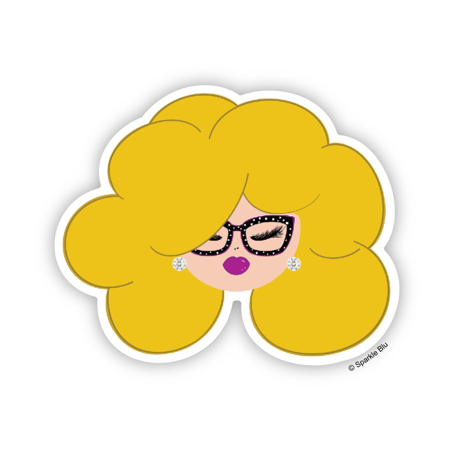 Meet Susan with her big, fluffy blonde hair and oversized purple glasses sprinkled with white polka dots. Her look is completed with fluttery lashes, deep plum lipstick, and of course, sparkling diamond stud earrings for that extra touch of richness.