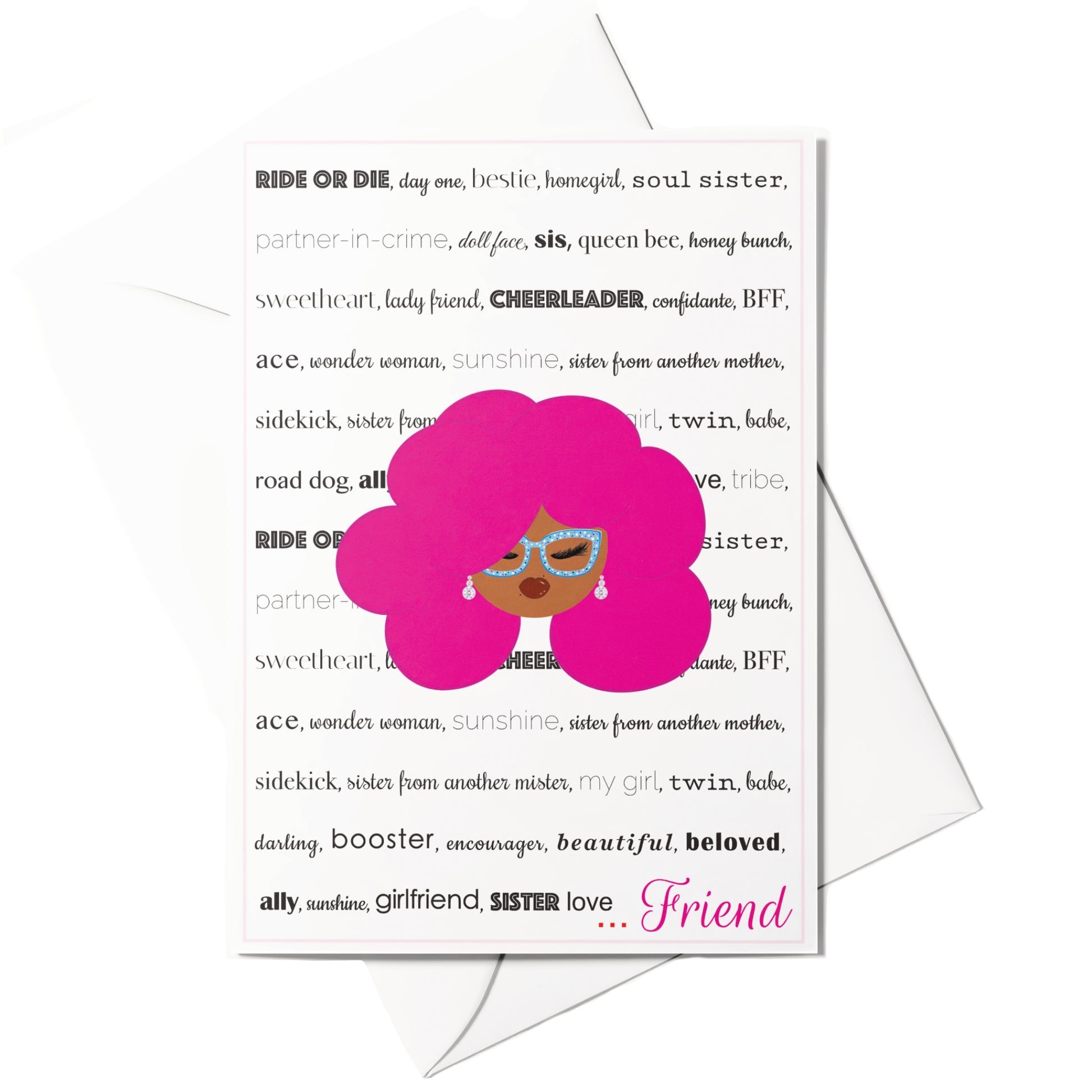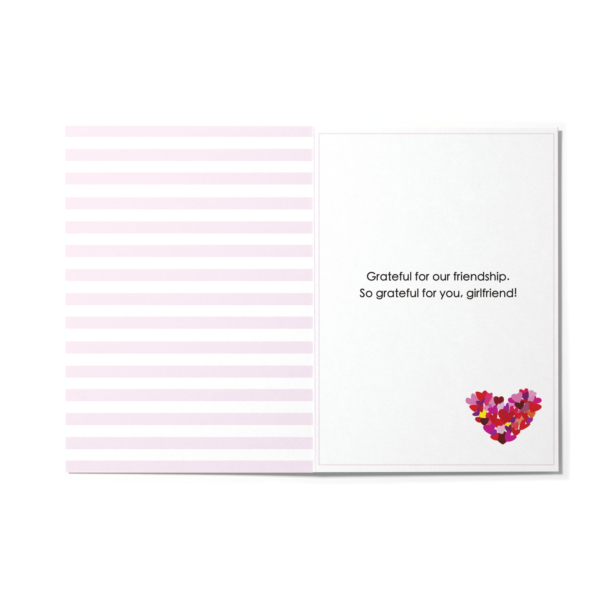 Celebrate the magic of sisterhood with this heartfelt card, starring a vibrant character who’s as bold as the bond you share. Adorned with empowering words that describe that friend, it opens to the perfect message: 'Grateful for our friendship. So grateful for you, girlfriend!' This card is a love letter to your ride-or-dies, soul sisters, and day-ones who make life brighter. Because celebrating your amazing female friends is always on point.