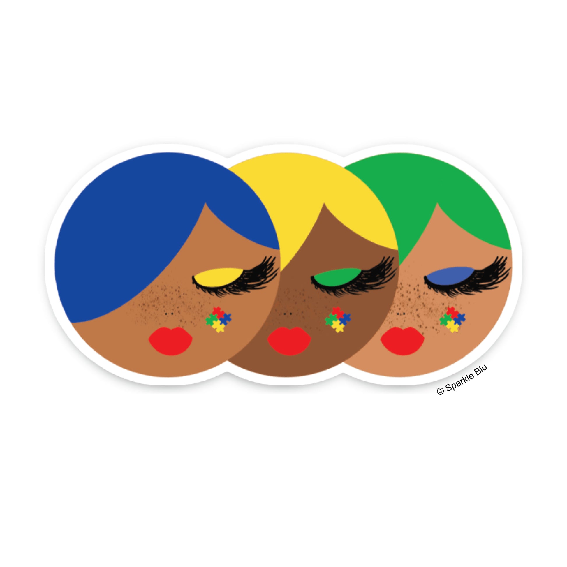 Celebrate the beauty of individuality with our bold Spectrum Beauties, Autism Awareness Sticker. This one-of-a-kind design features Blue with her striking blue hair, Mattea with her sunny yellow locks, and Apple with her vibrant green hair—each adorned with freckles, eyeshadow, and the autism awareness symbol. Perfect for spreading awareness, this sticker is as unique as the individuals it represents