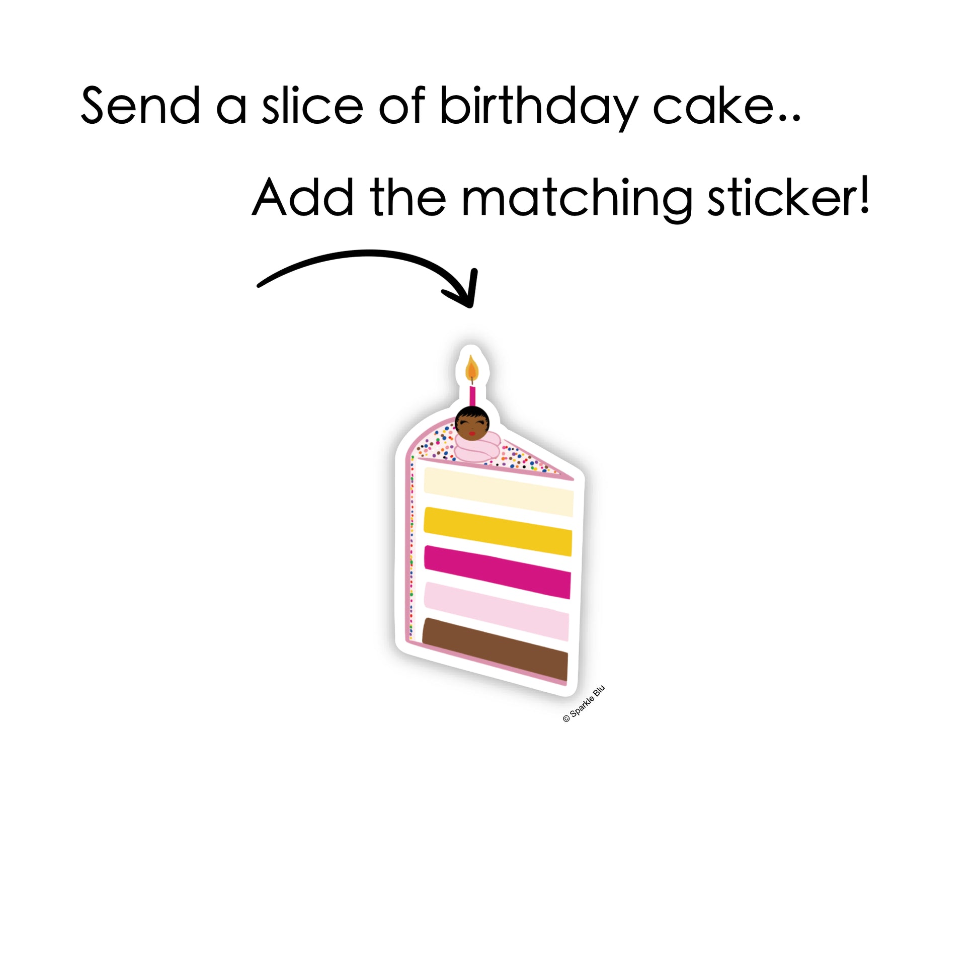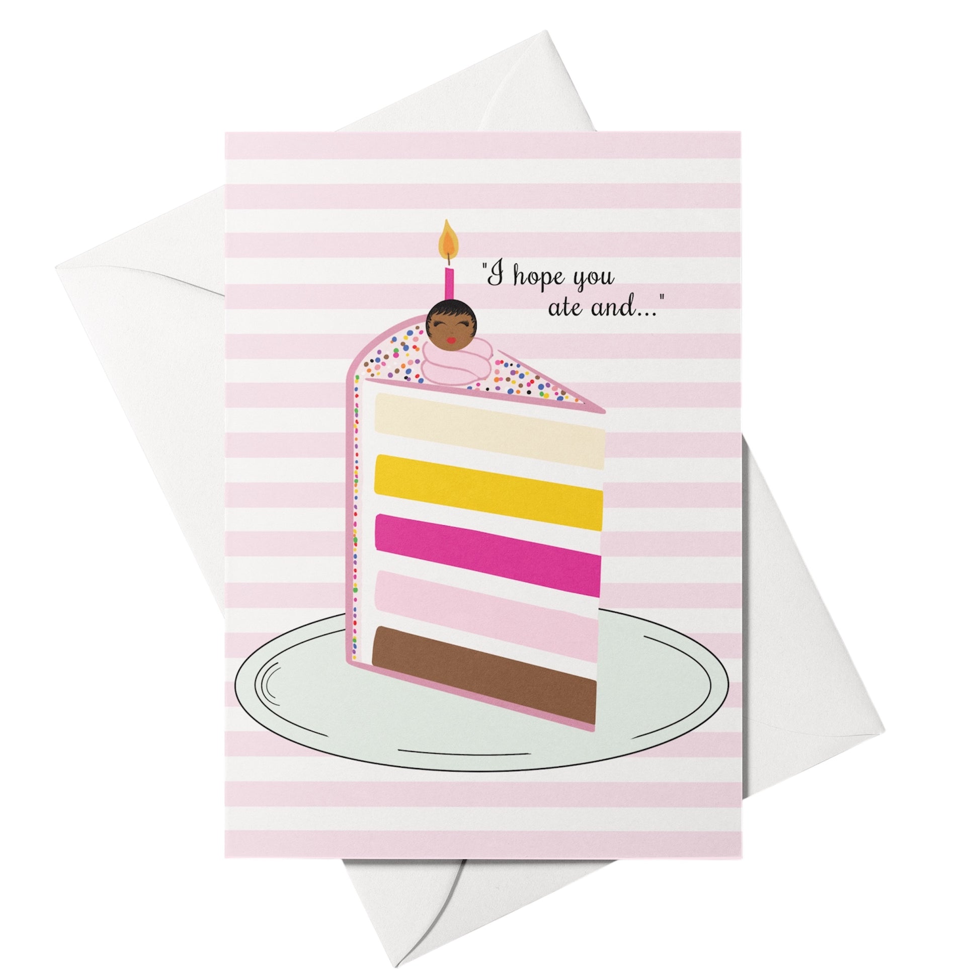We all know a woman who ate and left no crumbs. Celebrate her birthday with this cheeky card featuring a five layer slice of cake, a candle, colorful sprinkles, and one of our Sparkle Blu girls right on top.