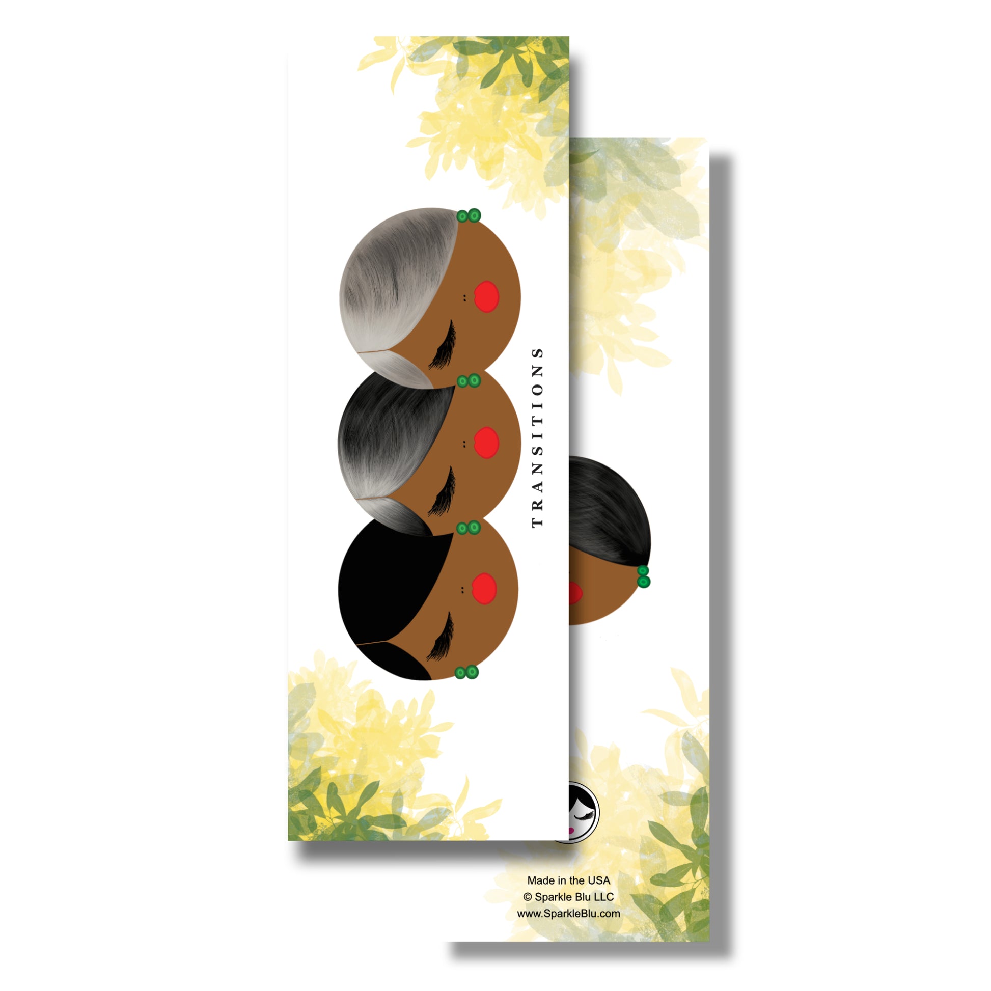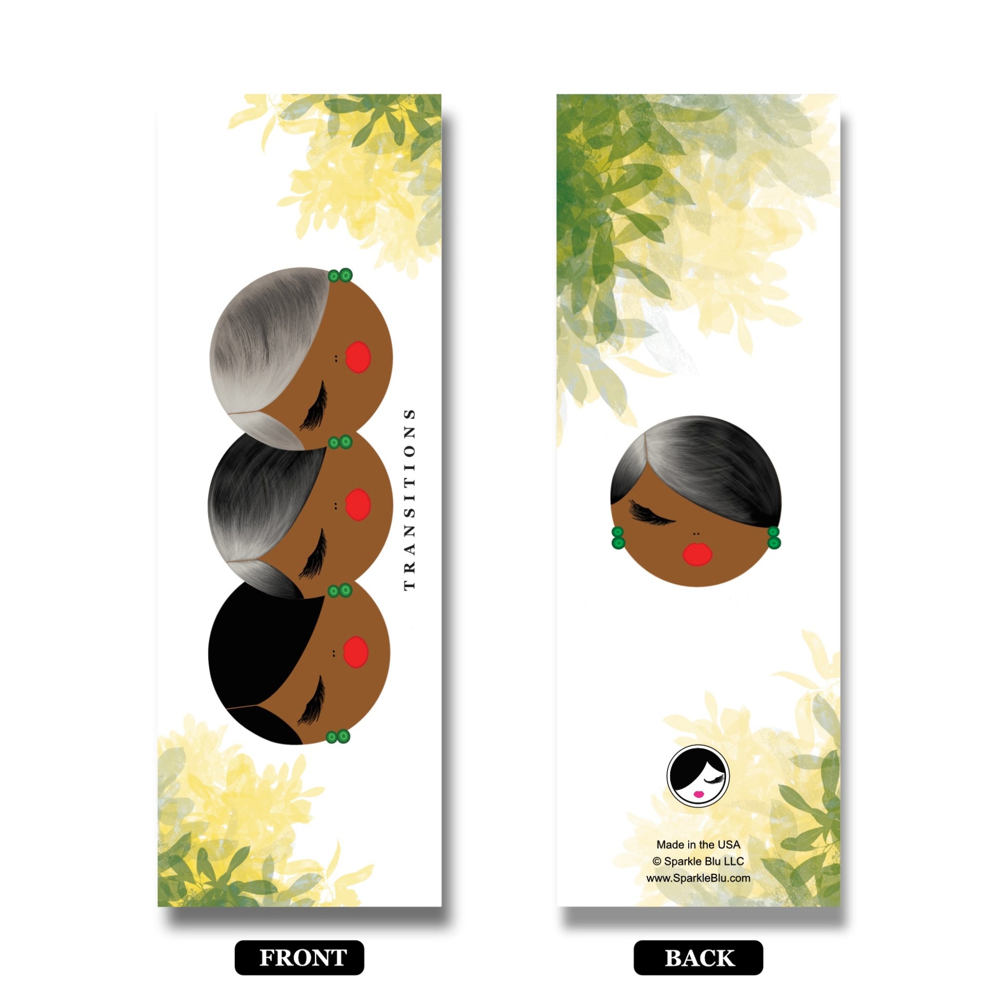 Introducing the Transitions Bookmark, a piece of art that not only holds your place in a book but also captures the essence of Flower's graceful hair journey. This hand-illustrated bookmark features Flower transitioning from black to salt & pepper, and finally to her gray hair crown, making it a perfect companion for your reading adventures.