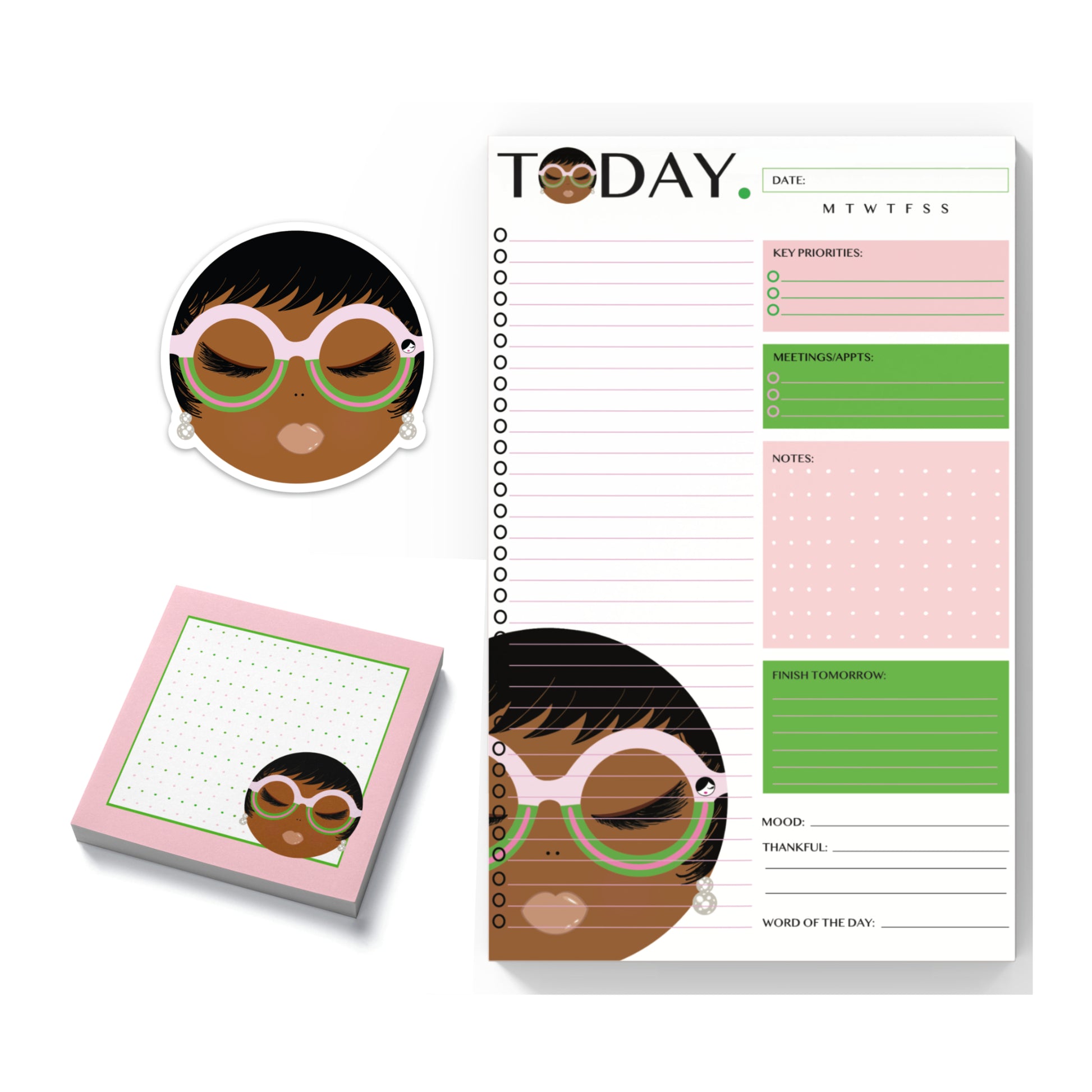 Vivianne Stationery Trio: This 3-piece set features a chic vinyl sticker, elegant pink and green sticky notes, and a thoughtfully designed daily planner notepad with sections for to-dos, gratitude, and more. With Vivianne’s sophisticated charm and functional designs, this trio makes it easy to stay organized while adding a sassy touch to your daily routine