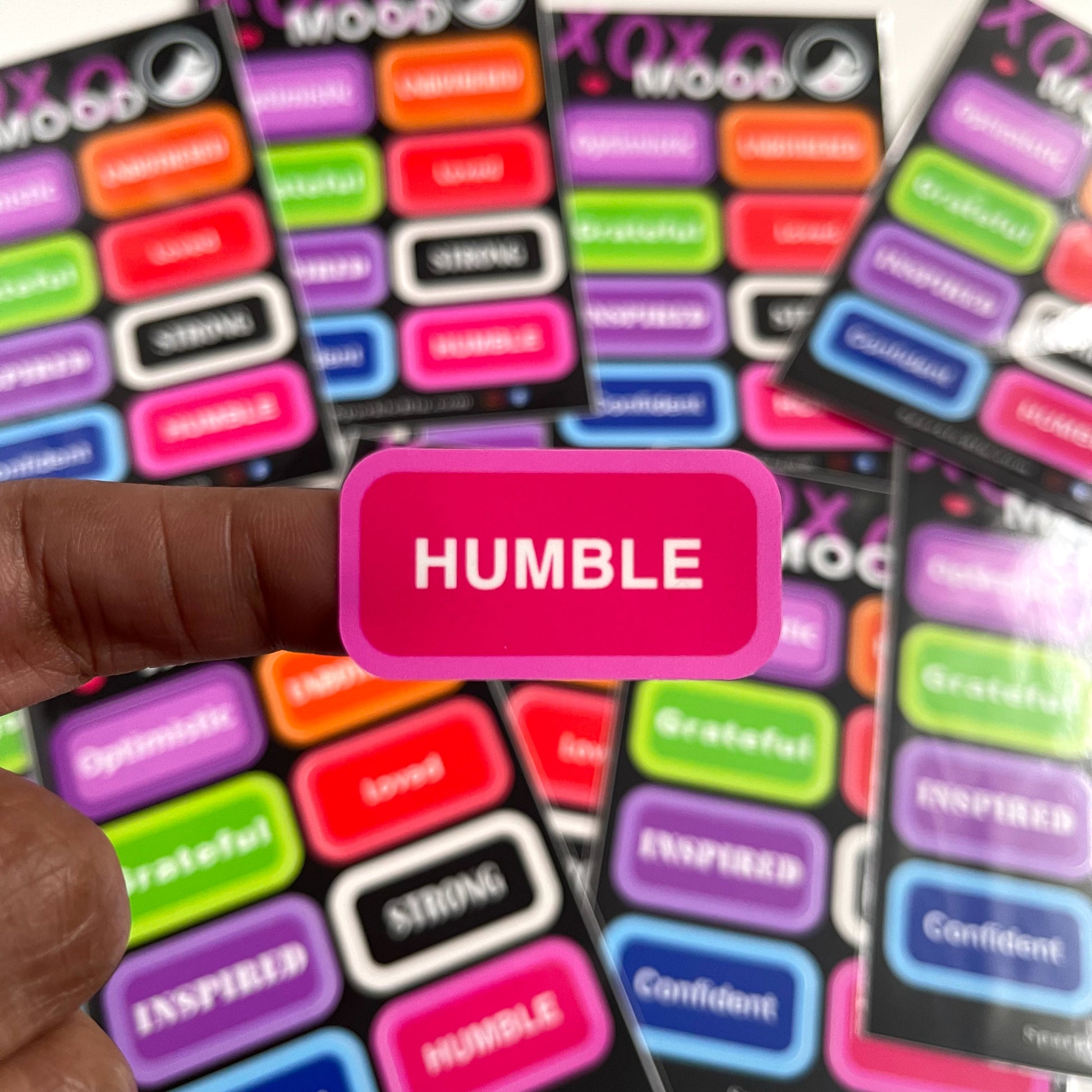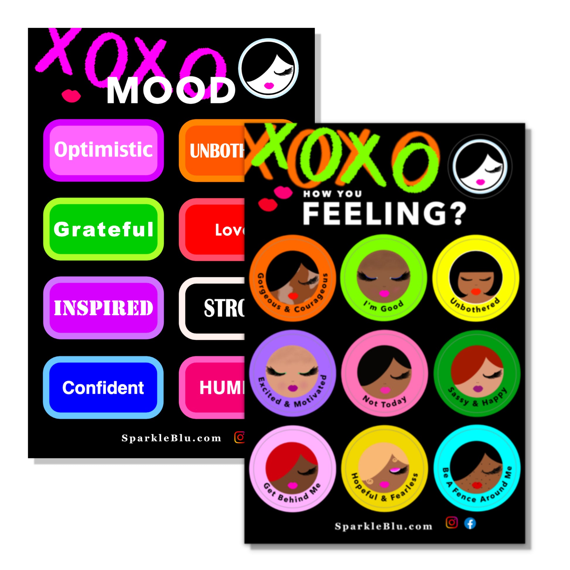 - Mood 1 Sheet: 9 stickers (Optimistic, Unbothered, Grateful, Loved, Inspired, Strong, Confident, Humble, and Sparkle Blu Woman Logo)